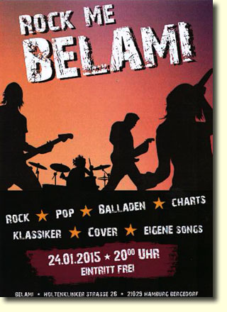 Sa., 24.1.: Das Musik ProjektBei den Clubabenden stehen donnerstags regelmäßig nationale und international erfolgreiche Berufs-Musiker auf unserer Bühne. ![]() Bereits im Januar 2014 hatte sich eine Gruppe Musiker aus Hamburg und Umgebung zusammengefunden, um gemeinsam Musik zu machen und diese einem breiten Publikum vorzustellen. Das "Musik-Projekt" hat allen so viel Spaß gemacht und so großen Anklang gefunden, dass es nun wiederholt wird. Am 24.1. treffen sich deshalb 9 musikbegeisterte Frauen und Männer, um unter dem Arbeitstitel "ROCK ME BELAMI" einen stimmungsvollen, vielseitigen und musikalischen Abend zu gestalten. Organisator Florian Hanisch: "Wir alle machen Musik aus Leidenschaft und als Hobby, einige auch schon professionell. Das Projekt wurde ins Leben gerufen, um auch denjenigen eine Plattform zu bieten, denen es nicht möglich ist, mit ihrem Programm einen ganzen Abend zu füllen. Bei dieser Gelegenheit haben sich auch einige der Musiker als Duos oder Trios zusammengefunden. Wir spielen Musik aus den letzten Jahrzenten bis hin zu den heutigen Charts. Die Musik lässt sich nicht in ein Genre einordnen, da von Pop, über Rock über Soul bis hin zu Balladen alles vertreten ist. Viele der Songs wird das Publikum wiedererkennen und auch mitsingen können. Es sind jedoch auch einige Eigenkompositionen dabei. Wir möchten unsere Vielseitigkeit und unser Herz für Musik auf der Bühne präsentieren und alle, die Lust haben, damit begeistern. Das BeLaMi gibt uns die Chance dazu!" Jacky singt aus Leidenschaft für sich selbst und spielt dazu Gitarre. Ihr einziges Publikum waren bisher Freunde und Familie. Gemeinsam mit den anderen Musikern traut sie sich nun auch auf die Bühne und hofft das Publikum mit ihrer Stimme zu begeistern. Florian macht schon sein halbes Leben lang Musik. Spielt Gitarre, singt alleine und im Chor und komponiert auch eigene Songs. Cathi ist eine junge, leidenschaftliche Sängerin aus der Nähe von Hamburg. Sie singt in einer Band und im Chor und hat Ihr Hobby zum Beruf gemacht. Sie singt von Soul, Pop bis Rock alles und präsentiert Ihre neuesten selbst geschriebenen Songs. Angelica ist die Musikerin mit Herz. Auch sie singt in einer Band und im Chor. In Ihrem Repertoire sind bekannte Songs aus Pop, Rock und Soul. Hajo Tastenfuchs ist der passionierte Magier an den Tasten und hat schon vielen Menschen Klavierspielen und Singen beigebracht. Er ist als Chorleiter und Bandleader aktiv. Die Musiker/innen spielen teilweise alleine, aber auch gemeinsam in verschiedenen Formationen.
